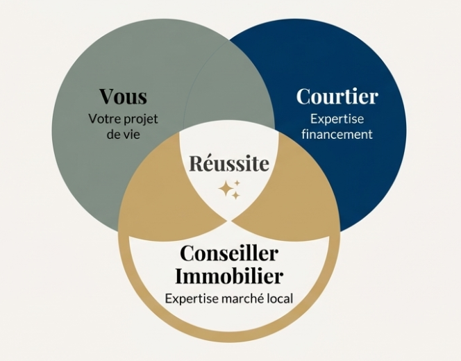 Lorsque je vous accompagne, nous vérifions ensemble la cohérence du projet avant même d’engager les démarches lourdes. C’est cette synergie entre votre conseiller immobilier, votre courtier et vous qui garantit le succès de l’opération.