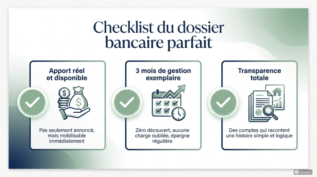 - Soignez votre « récit bancaire » : Montrez trois mois de gestion saine et un apport disponible pour rassurer votre banquier.