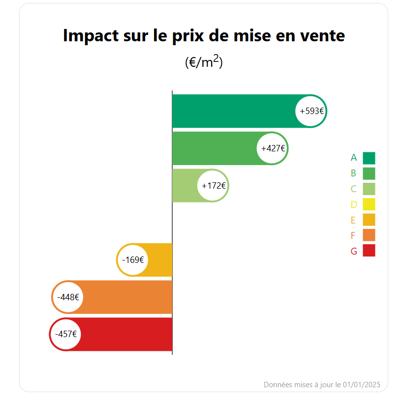 - L’impact sur le prix au m² : Un bien noté A est valorisé en moyenne de +593 €/m² par rapport à la référence D. Un bien B bénéficie de +427 €/m².