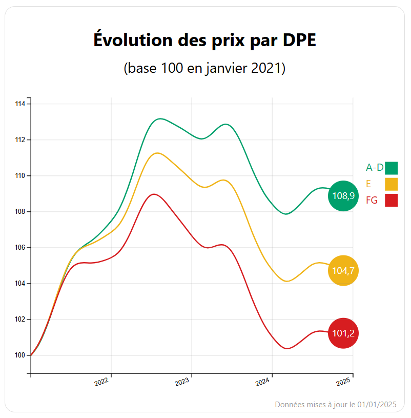 - L’évolution des prix : Entre début 2021 et début 2025, les prix des biens en A-D ont augmenté de 8,9% (base 100), ceux en F-G n’ont augmenté que de 1,2%.